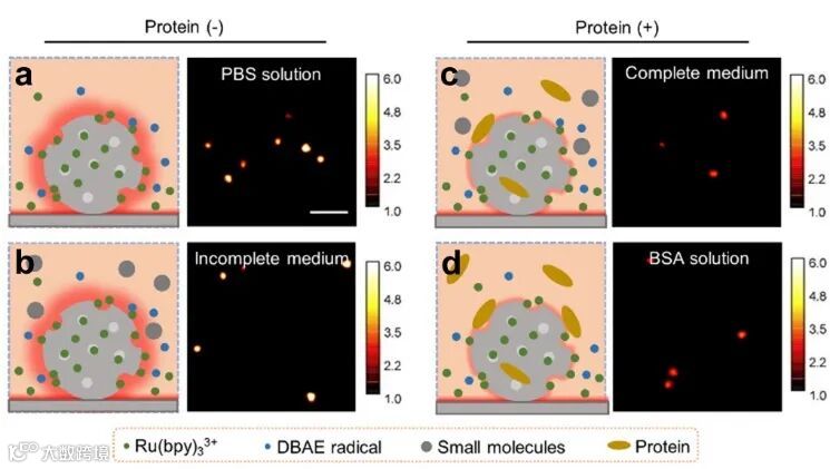 图2. 蛋白冠的形成对粒子增强局域电化学发光强度的影响。
