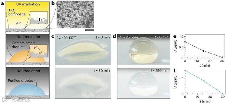 -EC-PDMS涂层上,可以看到,水滴分别在30 min和250 min后由淡橙色变为清澈,表明有机污染物被分解(图2c、d)。此外,他们还研究了Ti