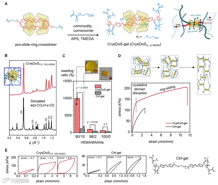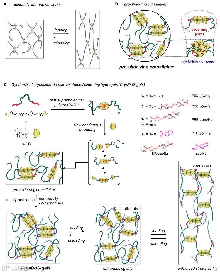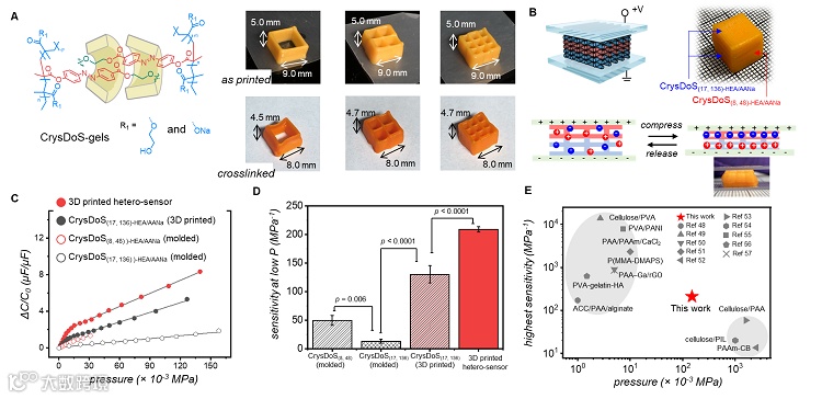 图3. 结晶增强双穿滑环水凝胶的3D打印及其高性能应力传感器的构筑。图片来源:Chem