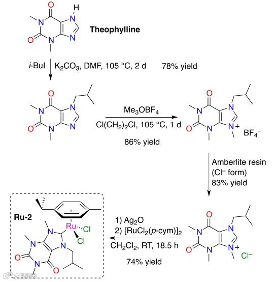 接下来,作者以茶碱衍生的黄嘌呤盐为原料合成了第二种[Ru