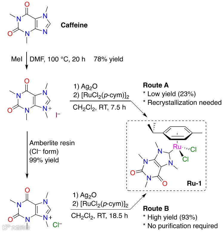 Lionel Delaude团队以咖啡因和茶碱作为可持续的生物来源NHC配体前体,制备了两种通式为[Ru