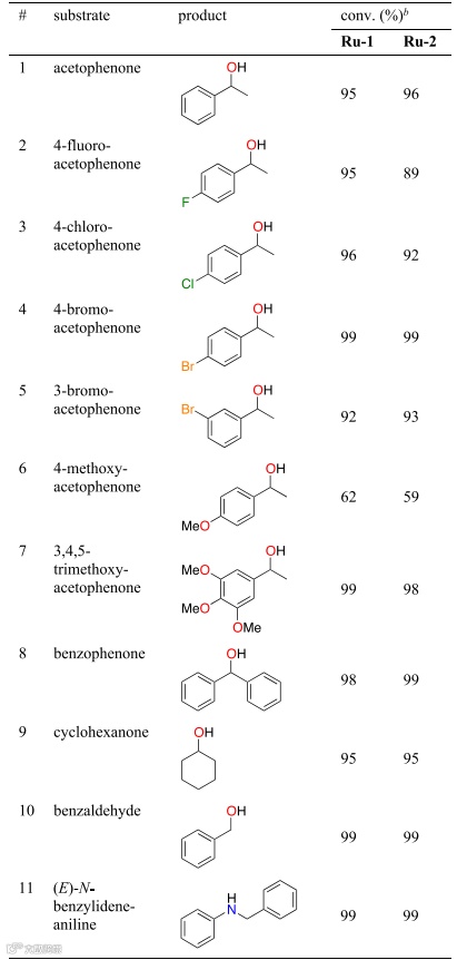 还原了各种不饱和底物(图5),结果显示两种配合物都表现出非常相似的活性,能够有效促进苯乙酮及其四种卤代衍生物、二苯甲酮、环己酮氢化成相应的醇。尽管4-甲氧基苯乙酮的转化率仅约60%,但3,4,5-三甲氧基苯乙酮在相同条件下则能实现定量还原。值得一提的是,苯甲醛的醛基和 (