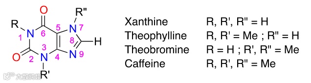 图2. 黄嘌呤和甲基黄嘌呤生物碱的结构及其环编号。图片来源: