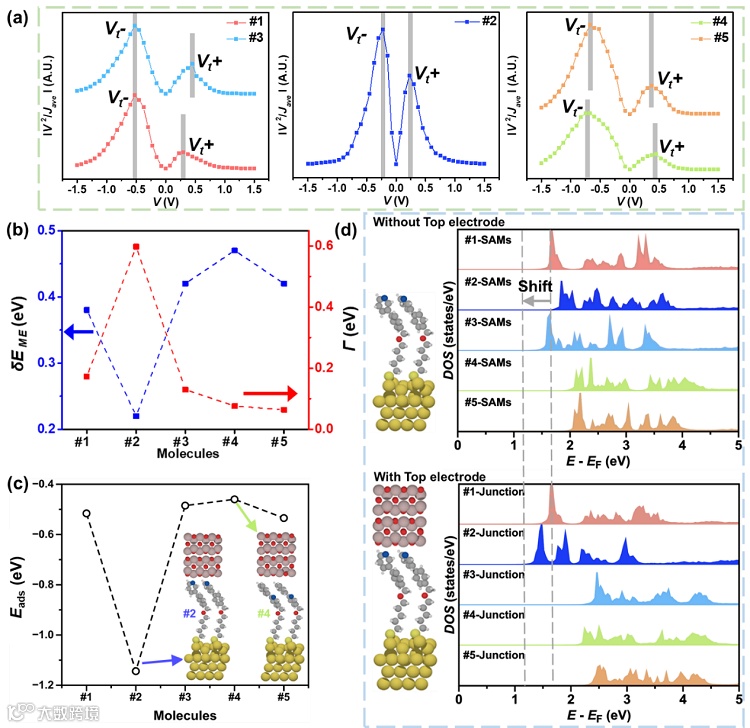 的LUMO最靠近电极费米能级且与电极费米能级之间的耦合最强。接着,文章进行DFT理论计算,并对现有结果进行进一步分析。从5种同分异构体与顶电极的吸附能计算结果可以看出,分子