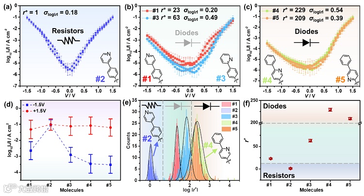 正向偏压下的电流显著高于负向偏压下的电流,可作为高性能分子二极管,整流比都超过200;3) 分子