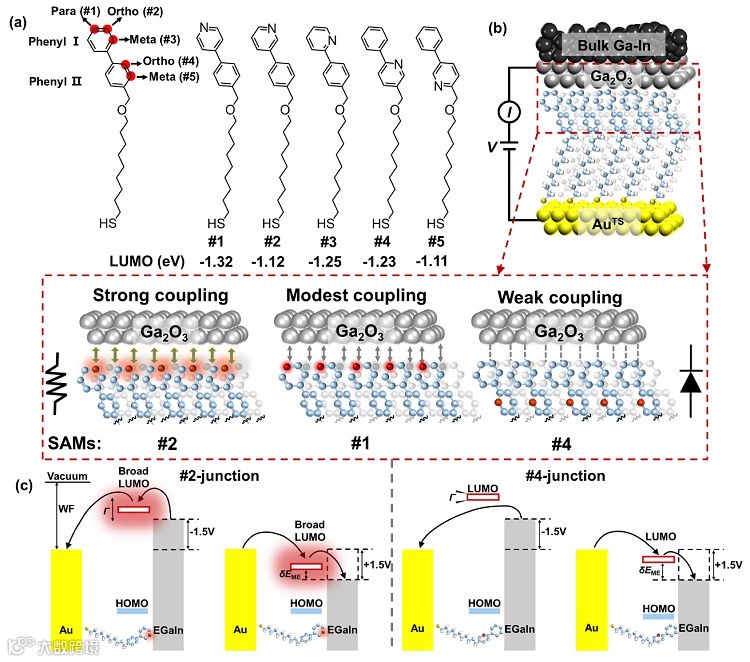 (图1a),并基于镓-铟液态金属 (EGaIn) 电极技术制备了可能具有二极管功能的分子器件 (图1b),希望可以通过改变氮杂联苯基中氮原子的位置,实现分子-电极耦合强度的精细调控。