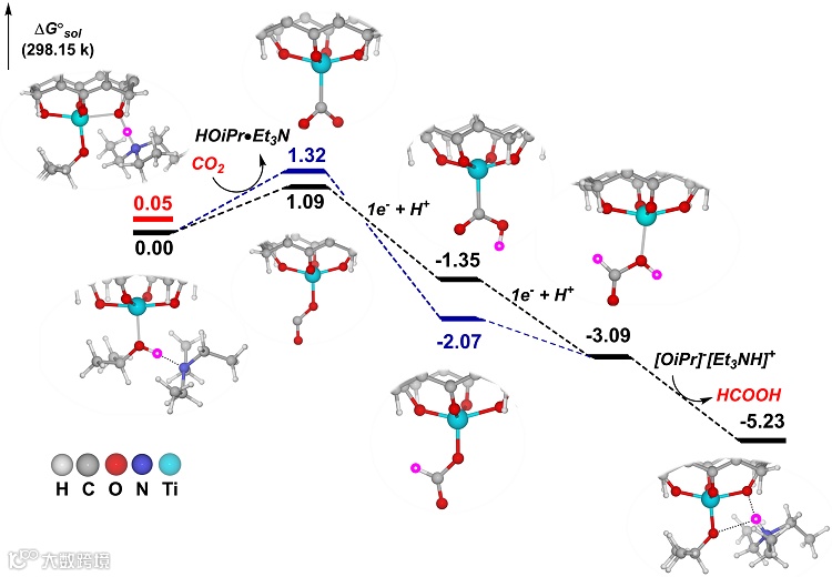-to-HCOOH转化反应途径及其相应的吉布斯能和中间体结构。
