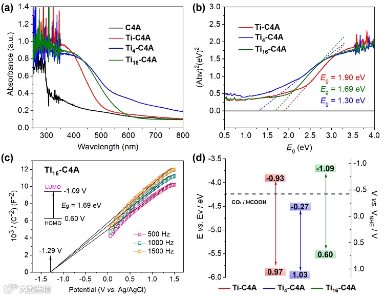 的光学带隙分别为1.90、1.30和1.69 eV,说明这些C4A配体修饰的钛氧化合物均具有类半导体特性(如图2d所示)。以此为基础,作者进一步通过测试莫特肖特基测试确定了