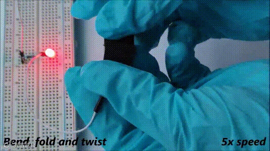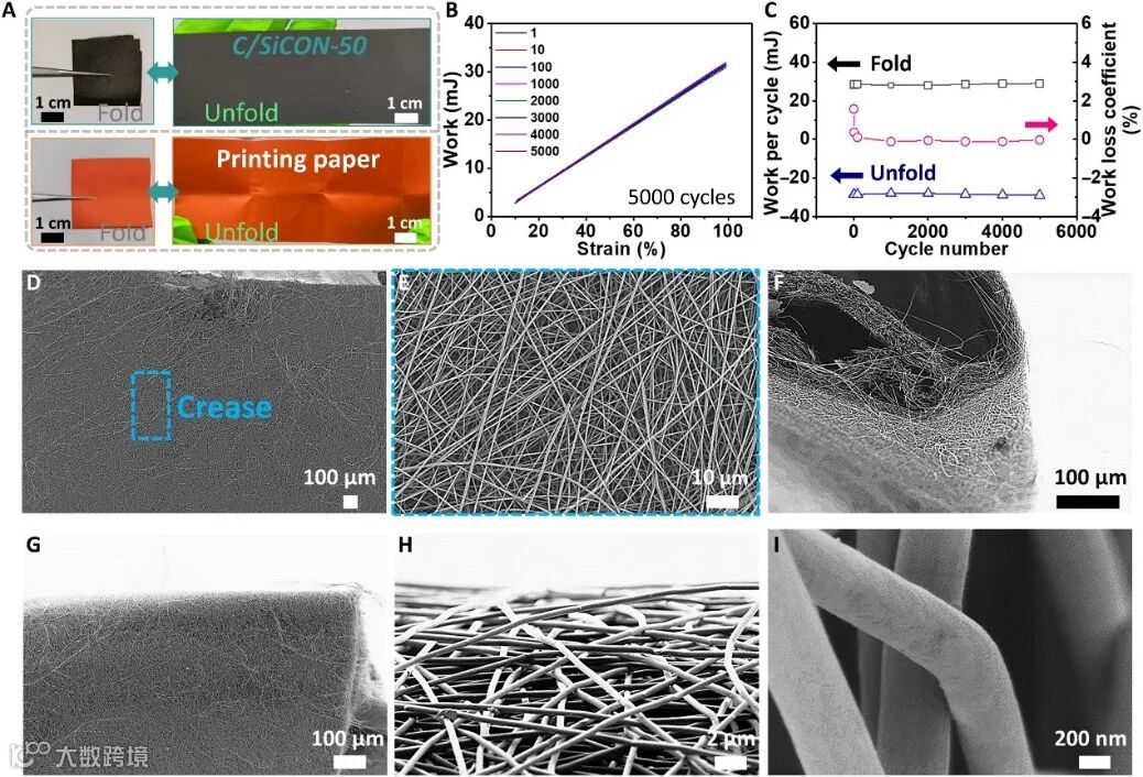 当然,随着SiCON含量增加,电导率略有下降,从20.1 S cm-1逐渐降低到4.2 S cm-1。不过,陶瓷相并没有阻止电子通过纤维中的碳材料相之间进行传输,不但可以点亮发光二极管,在弯曲、折叠5000次循环后,材料的电阻几乎不变,发光二极管的亮度在视觉上也没有变化。此外,非织造材料电导率在−50 °C到300 °C间,仅略有增加,说明材料工作温度范围相当广。