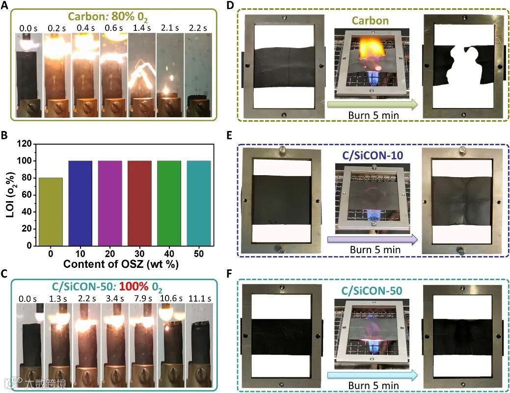 C/SiCON非织造材料的阻燃性和热稳定性。图片来源:Sci. Adv.