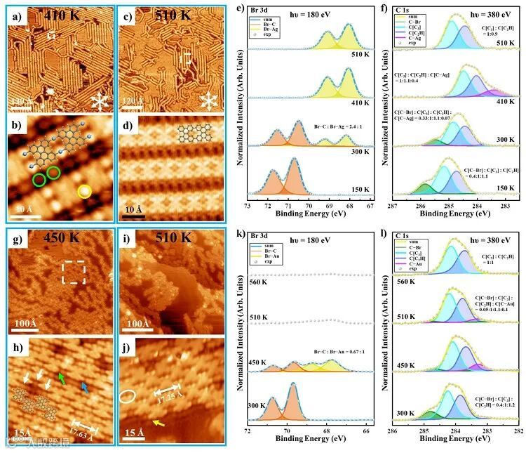 远低于共价偶联温度,在脱溴后能够形成稳定的金属有机中间体。由于C−Ag−C键的可逆性,在逐步升温退火过程中有机金属链向着热力学更稳定的多孔有机金属聚合物转变,这种热力学占优的有机金属中间体作为后续共价偶联的模板最终合成共价多孔石墨烯纳米条带。而在Au(111)表面,由于脱溴过程成为Ullmann反应的决速步,TBDBTP在脱溴后立即发生C−C偶联,不会产生金属有机中间体。在TBDBTP部分脱溴后,在动力学驱动下产生共价交错链,并在进一步退火后发生横向偶联,形成2D多孔石墨烯纳米片。