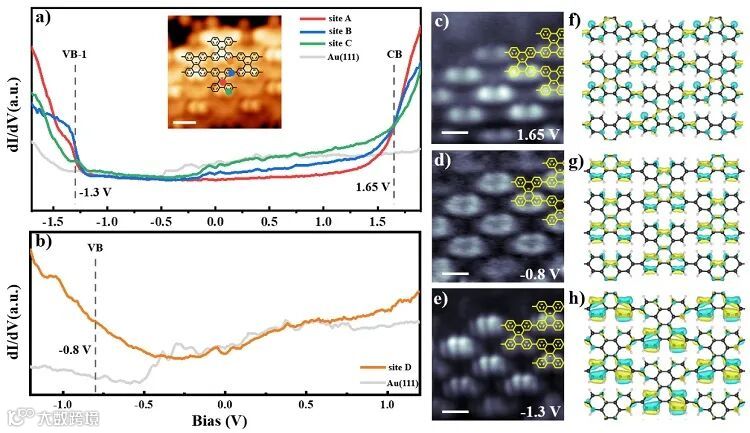 进一步探究了含有周期性非平面孔的2D石墨烯纳米片的电子结构,dI/dV map表明,其导带(CB)、价带(VB)和VB-1三个波段对应的电子波函数都明显局域在指向表面外的翘曲苯环上。这表明单体中心的两个碳原子优先参与翘曲苯环的π共轭,而非准平面的苯环。这种由于非平面构象导致的π共轭破坏使得VB和CB都局域在π共轭较大的结构上。