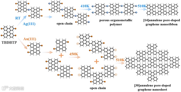选择性地在Ag(111)表面上合成了含有周期性非平面[14]annulene孔的一维(1D)石墨烯纳米条带,在Au(111)表面上合成了含有周期性非平面[30]annulene孔的二维(2D)石墨烯纳米片。