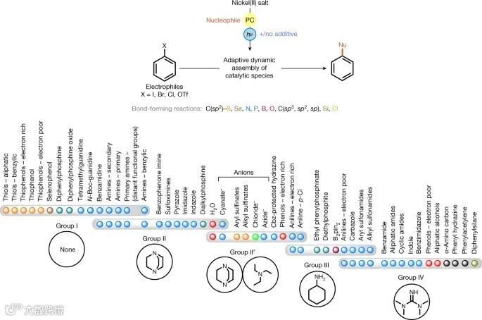 (图1)。该催化体系具有自调节特性,可在交叉偶联反应中对数十种不同类别的亲核试剂进行简单分类,并利用九种不同的成键反应(如:C(