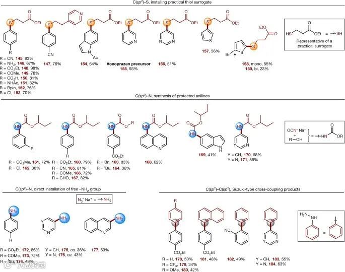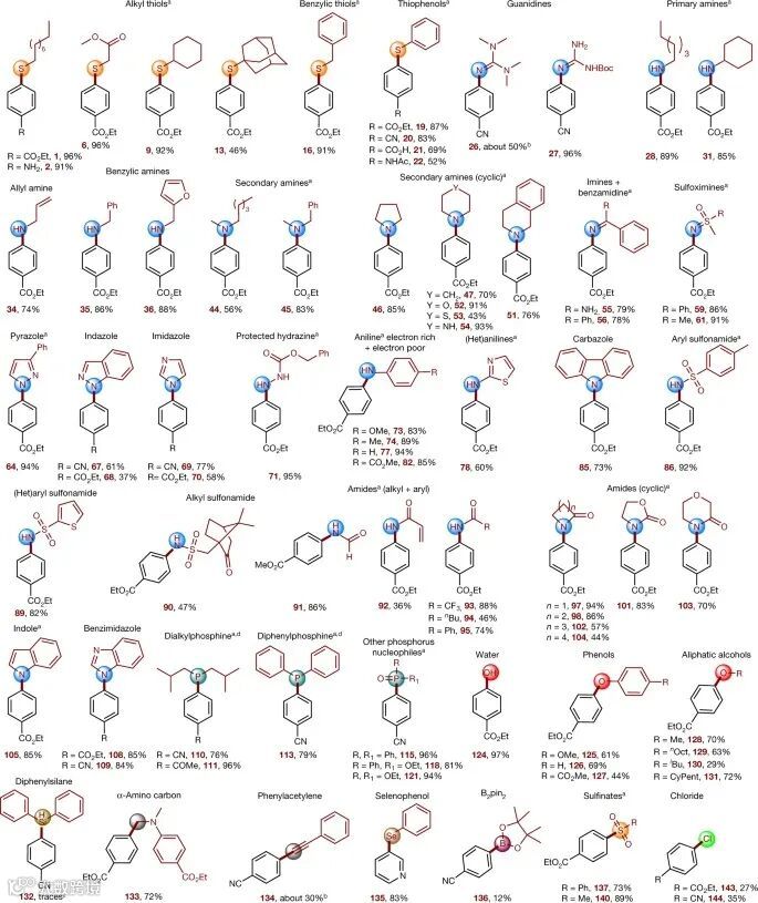 )、Si、Cl)实现了数百个分子的合成。此外,该方法无需优化预催化剂、配体和碱,只需要改变添加剂和其它条件(如:亲核试剂、溶剂)即可实现偶联反应。相关成果发表在
