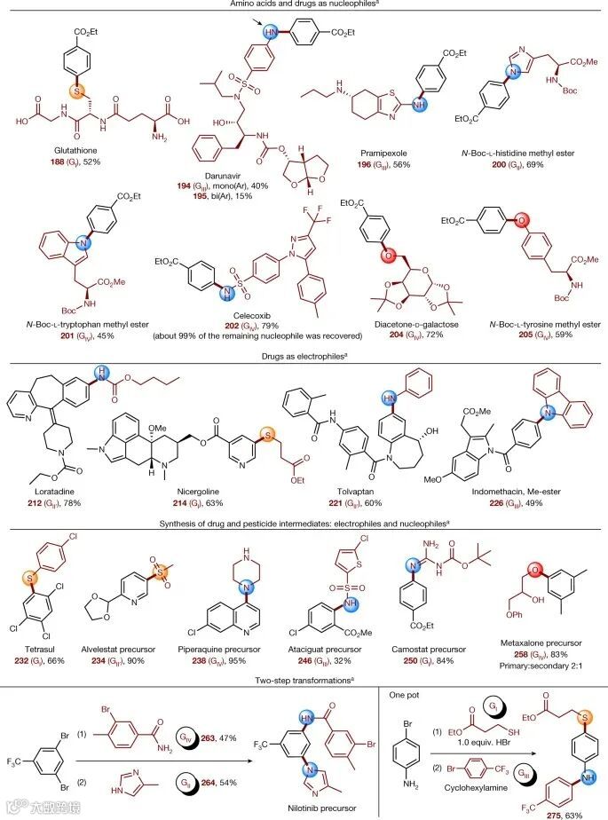 图5. 生物相关分子的官能团化以及药物分子和中间体的合成。图片来源: