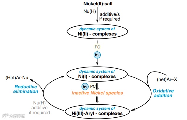 族非常弱的亲核试剂,TMG可能更有效,这是因为其对Ni(II)的连接能力更强,并且强碱性允许亲核试剂进行去质子化,使其能够与镍配位并有效地进行还原消除。在此基础上,作者提出了可能的反应机理:即在光氧化还原条件下,Ni(II)物种被还原为Ni(I)络合物,后者与(杂)芳基卤化物进行氧化加成得到Ni(III)物种,随后经还原消除产生相应的交叉偶联产物并再生Ni(I)络合物(图4)。