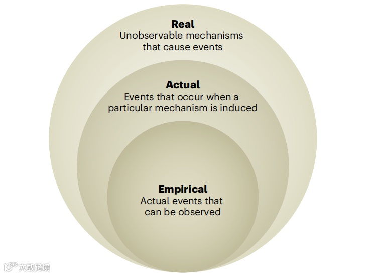 Blackie教授认为,科学的客观性与科学家本人是“脱钩”的。根据Roy Bhaskar的论著《科学的现实主义者理论》(A Realist Theory of Science)描述:世界可由外向内分为“真实”(Real)、“事实”(Actual)、“经验”(Empirical)3个领域(下图)。“真实”领域是所有“机制”(Mechanisms)的根源;“事实”领域包含发生的“事件”(Events),其中特定的机制被归纳出来;“经验”领域是我们人类可以观察“事实”事件的领域。科学知识背后控制世界运转的“机制”是客观的,科学家却不是被动、中立的观察者,而是一类被他们所在社会环境和教育及训练所塑造、以特定方式从事科学实验、并对自己的工作产生特定认识和理解的人群。因此,科学家是主观的。