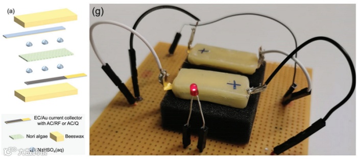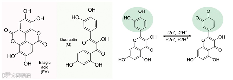 Mario Caironi团队选择了4种可食用的天然氧化还原化合物作为电池负极和正极备选材料,分别是食品添加剂靛胭脂红、维生素B₂,以及食品配料槲皮素、鞣花酸。由于这类化合物电导率低,不能单独作为电池的电极,他们将这类化合物与活性炭混合,形成氧化还原复合材料。其中,靛胭脂红、维生素B₂、槲皮素用水-乙醇溶解后,掺入活性炭中,鞣花酸则用纯乙醇溶解后,掺入活性炭中。他们将这样的复合材料和乙基纤维素结合,再贴上食品级金箔(据说灵感来自蛋糕师……),构建了电池的电极部分。