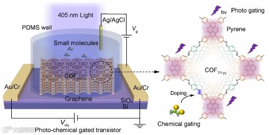 传统化学晶体管对小分子的灵敏检测依赖于小分子本身的电荷性质,这意味它们很难对弱电荷性质的小分子实现超灵敏检测。共价有机框架(COFs)材料具有高稳定性和高结晶性的特点,能够在复杂的检测环境中稳定存在。COFs的介孔结构和丰富的活性位点有利于目标物质的高效识别。光敏共价有机框架材料作为石墨烯通道的修饰层,吸收光能后产生大量的光生电子。光生电子会被捕获在COF/石墨烯的界面,进而引入额外的光栅调控。在光栅和化学栅的协同作用下,小分子识别产生的电流响应被显著放大。
