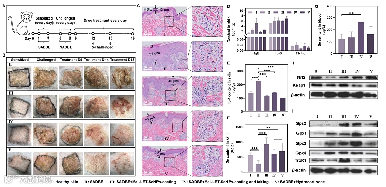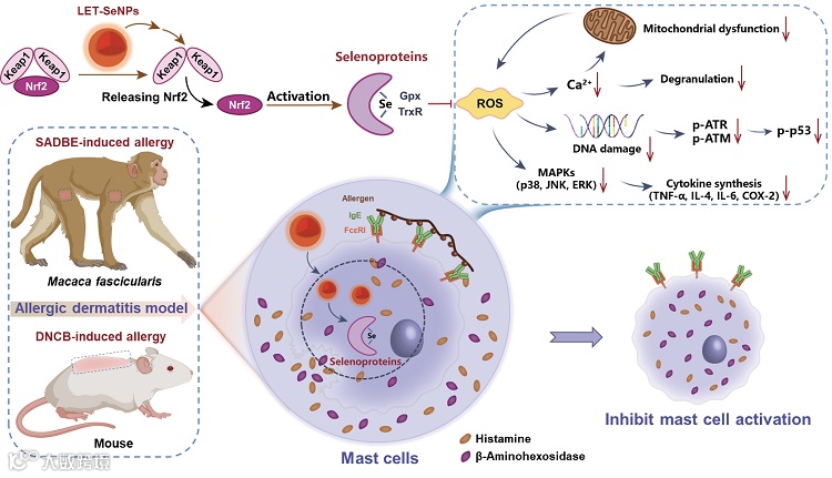 针对过敏性皮炎的生物特点,该团队利用硒元素构建了一种抗过敏纳米硒(LET-SeNPs)的简便合成策略,