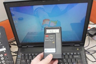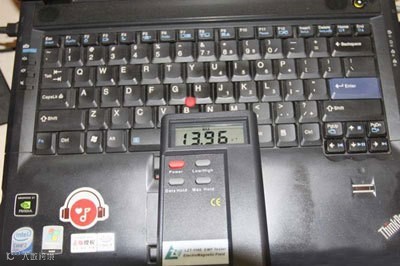 但是,当辐射仪器位于笔记本键盘上方时,辐射值迅速攀升到13.96μt,贴近液晶显示屏辐射值达到14.61μt,辐射值虽然超过了安全标准,但是只要我们在使用笔记本的时候保持20厘米以上的距离,就不会有辐射的危害。