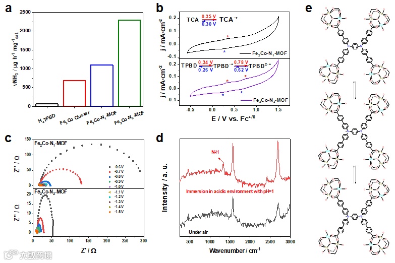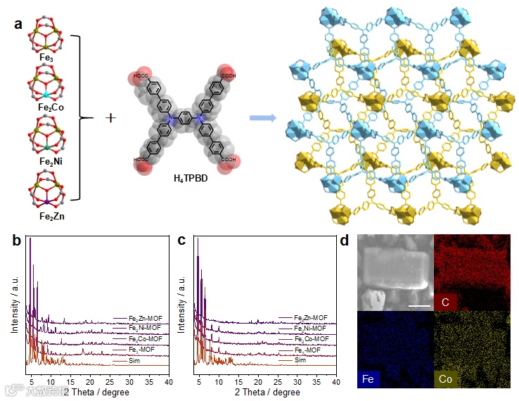 与羧酸配体形成强配位键构成稳定的Fe基三核团簇节点,通过与具有氧化还原活性的双三芳胺配体(