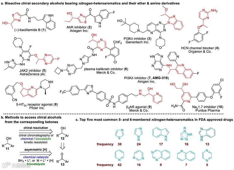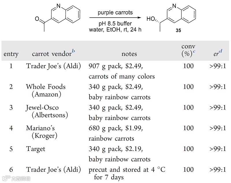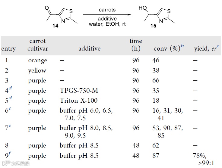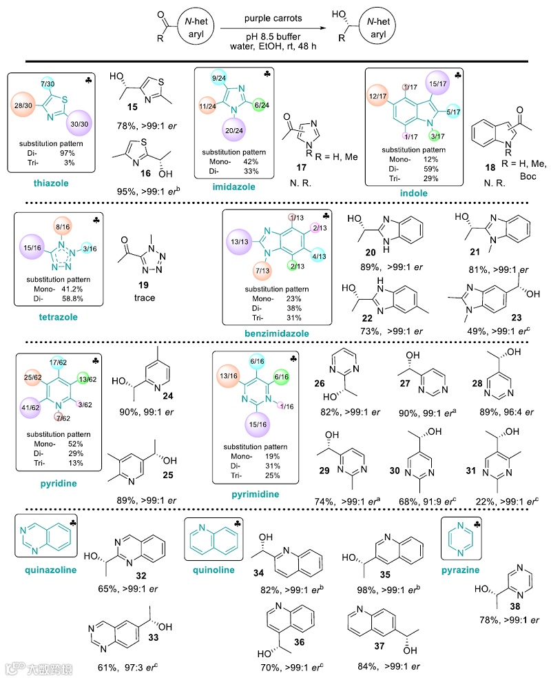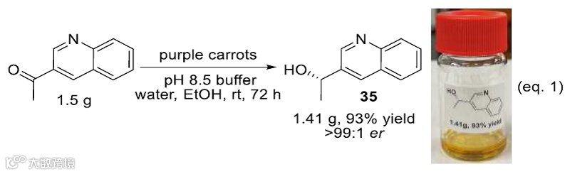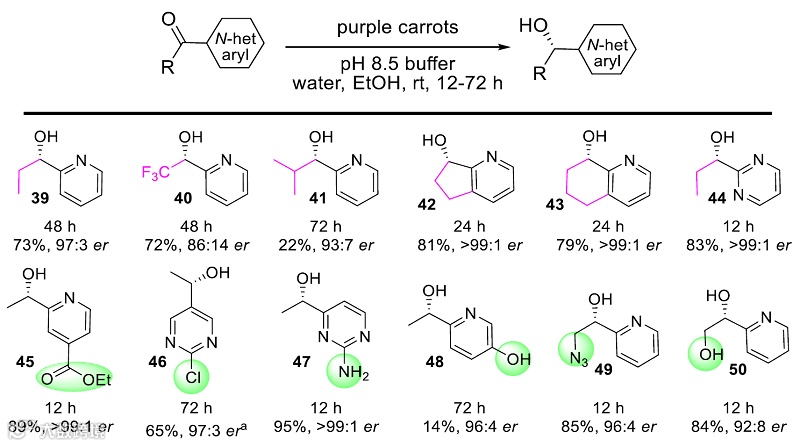 AbbVie研究团队使用简单的反应装置,在缓冲溶液中用紫色胡萝卜成功地实现了酮类化合物的对映选择性生物还原。该体系首次对8个氮杂环化合物进行研究,并发现其中7种氮杂芳烃骨架可耐受该反应,包括:噻唑、苯并咪唑、吡啶、嘧啶、喹唑啉、喹啉和吡嗪,进一步凸显出该反应的底物范围广。此外,该反应可实现克级规模制备,从而满足了药物化学早期研发所需的物质供应需求,同时为药物化学家建立化合物库和其它生物活性分子的合成提供了新策略。这种反应的安全性特别值得称道,除了起始酮类,实际上没有使用有毒的还原化学试剂,而溶剂就是水和微量乙醇。