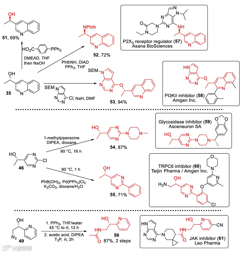最后,作者对手性醇产物进行了一系列衍生化(图7),具体而言:1)新生成的手性醇(35→51)很容易通过Mitsunobu反应从 (S) 转化为 (R);2)醇35可顺利转化为氨基(52)和醚(53)衍生物;3)化合物46与1-甲基哌嗪经SNAr反应得到产物54,或者与PhB(OH)2进行Suzuki偶联反应得到产物55;4)化合物49经Staudinger反应将烷基侧链转化为胺中间体,可进一步转化为酰胺56。