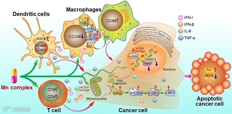 图6. 锰配合物损伤DNA、激活抗肿瘤免疫反应的作用机制