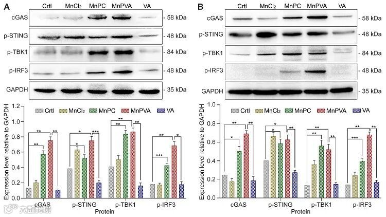 以上结果表明,在肿瘤细胞和免疫细胞中,MnPC和MnPVA对cGAS-STING信号通路的刺激能力远高于MnC