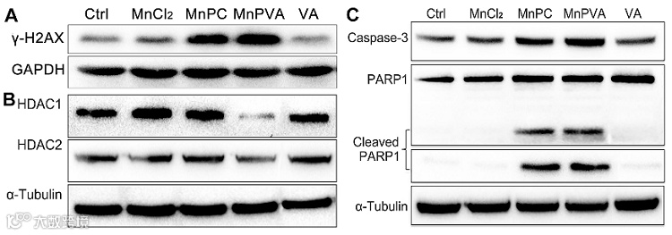 一方面,MnPC和MnPVA通过嵌入和氧化作用损伤细胞核或线粒体DNA,而且作为HDAC和PARP抑制剂阻止DNA损伤修复,从而增强DNA损伤(图2),直接诱导肿瘤细胞凋亡,产生较强的细胞毒活性(表1)。