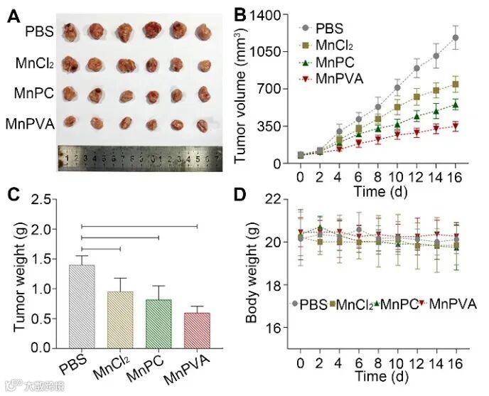,(C)肿瘤重量,(D)小鼠体重。