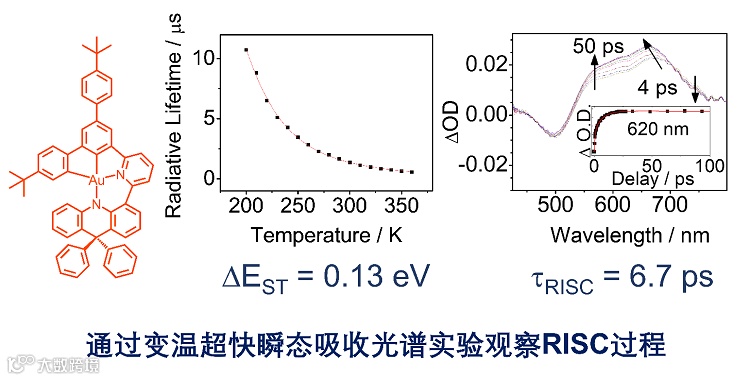 升高而提升的发射强度可证实这些配合物的TADF性质。同时它们的单重激发态与三重激发态间的能隙 (Δ