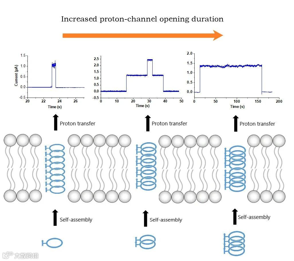 图2. 大环单体、二聚体和四聚体在平面脂质体双分子层氢离子传输实验及组装示意图