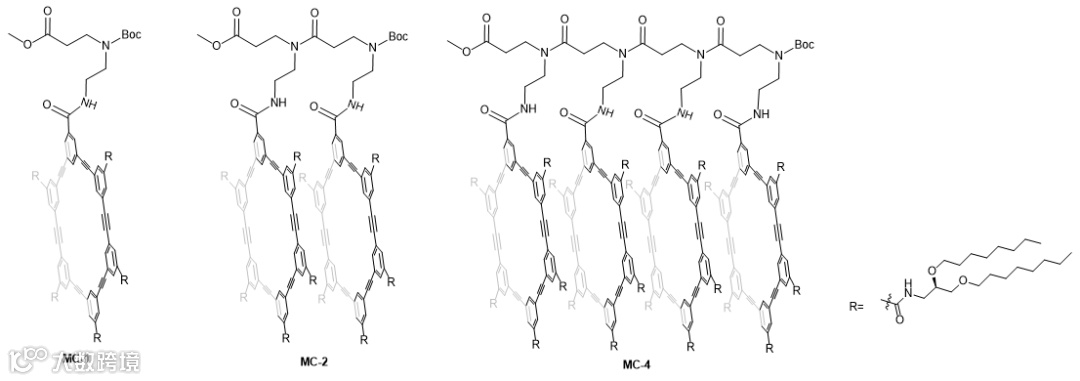图1. 六元(间苯乙炔)大环单体以及由肽链连接的大环二聚体和四聚体的结构