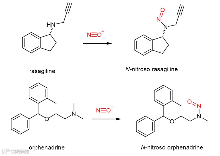 图1. Rasagilin和orphenadrine产生的NDSRI亚硝胺杂质。