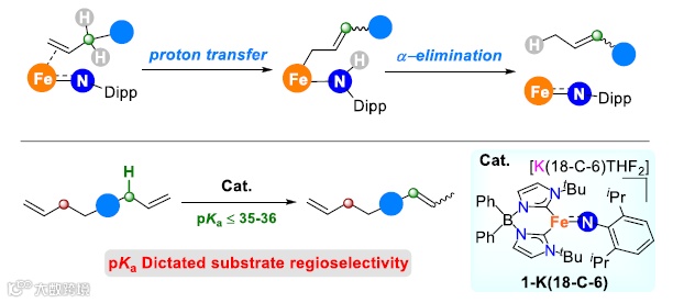 综上,本文报道了通过高自旋二价铁亚胺基配合物催化烯烃的1,3-质子转移反应实现了从1-烯烃到2-烯烃的异构化。反应是由铁中心和亲核性亚胺基配体的协同作用实现的。底物烯丙位质子的pKa决定着反应的选择性。这些结果不仅为过渡金属催化的烯烃异构化提供了一种全新的策略,同时也发展了金属亚胺基配合物新的反应模式。