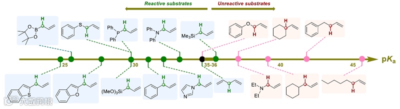 图4. 理论预测的代表性烯烃中烯丙位质子pKa的变化趋势。图片来源:J. Am. Chem. Soc.