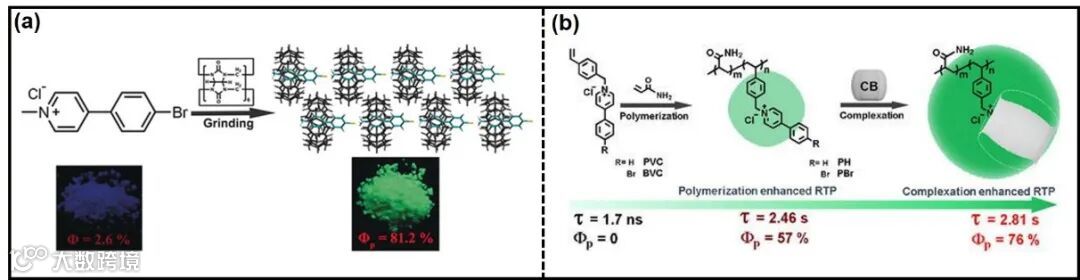 图1.(a)葫芦[6]脲增强固态超分子的高效室温磷光;(b)超长高效室温磷光的协同增强策略。