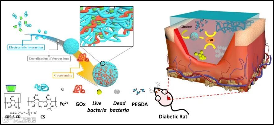 糖尿病伤口是常见于糖尿病患者之中的一种慢性伤口,其中开放伤口处的高糖和炎症的微环境,给细菌的增殖提供了一个良好的环境,而细菌感染将进一步造成此类伤口愈合缓慢。因此,如何快速地杀灭伤口处感染的细菌以及对创面进行合理保护是解决伤口愈合缓慢的关键。刘育教授团队将磺丁基-β环糊精、壳聚糖、亚铁离子以及葡萄糖氧化酶通过静电相互作用以及多重氢键相互作用逐步构筑出了一种全新的超分子纳米限域级联反应器(图4)。将此反应器应用于治疗糖尿病慢性伤口上,葡萄糖触发的超分子级联反应过程可以持续地产生羟基自由基快速杀灭糖尿病伤口附近的细菌,同时产生的羟基自由基可以引发水溶性乙烯基单体(PEGDA)发生自由基聚合反应在糖尿病伤口处原位形成水凝胶网络,进而对伤口进行半封闭的保护,防止伤口被细菌感染。该研究采取了一种“一石二鸟”的策略实现了消除糖尿病伤口细菌感染和原位保护的伤口的效果,协同促进了糖尿病慢性伤口的愈合过程(