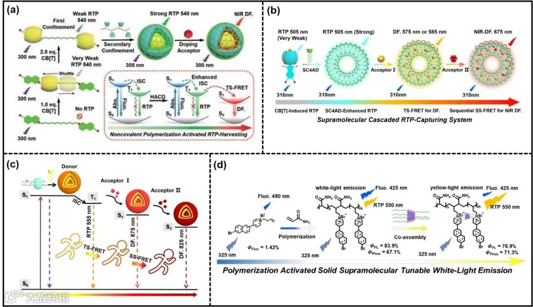 图3.(a)非共价聚合活化水溶液中的超强近红外室温磷光能量转移;(b)超分子级联室温磷光捕获;(c)超大斯托克斯位移磷光光捕获;(d)通过溴萘基吡啶聚合活化固体超分子产生可调谐的超强白光发射。