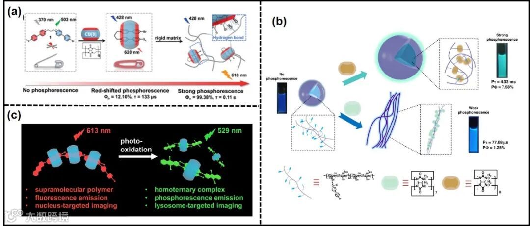 图2.(a)超长高效磷光的超分子别针示意图;(b)超长纯有机水性磷光超分子聚合物用于靶向肿瘤细胞成像;(c)光氧化驱动的纯有机室温磷光溶酶体靶向成像。