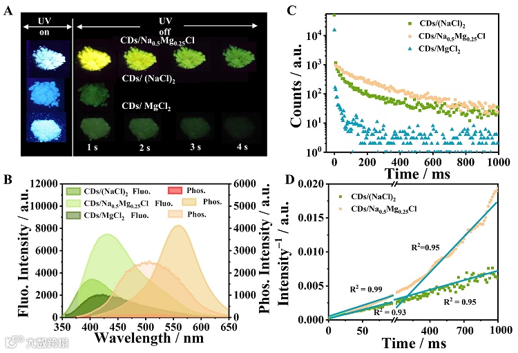 图2. CDs/Na0.5Mg0.25Cl,CDs/(NaCl)2和CDs/MgCl2(A)在紫外灯(365 nm)开/关后的光学照片;(B)稳态光致发光光谱;(C)时间分辨磷光衰减;(D)磷光强度倒数(I-1)与时间(t)的函数关系。