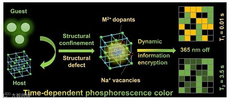 在信息加密技术领域,相比于目前大多数静态磷光材料,时间依赖性变色磷光(TDPC)材料展现出显著的优势。TDPC材料可以在时间维度上利用额外的通道,实现多级加密模式和动态存储,从而将信息加密提升到一个新的安全高度。然而,目前可用的大多数有机TDPC材料存在合成繁琐,光稳定性差,不适合长期信息存储等问题,这极大的阻碍了其广泛应用。解决当前困境的有效途径之一在于如何赋予现有的低成本、无毒发光材料新的TDPC特性,以应对紧迫的信息加密需求。