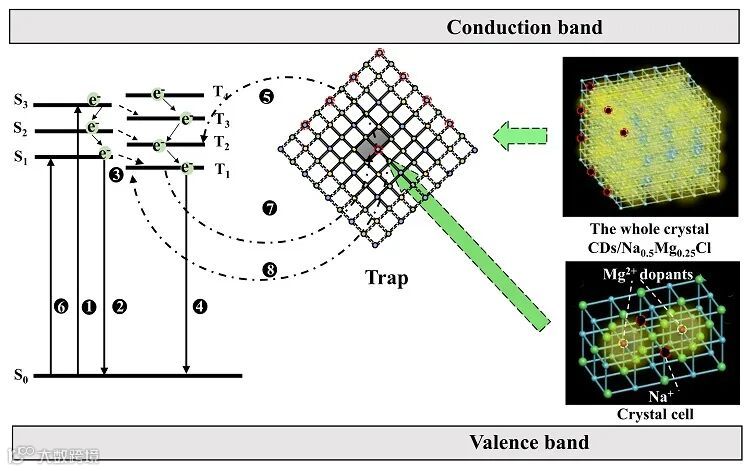 激子的转移过程主要涉及两种结构效应(图3),它们分别在稳定激子中起主导作用:1)结构限域效应,在紫外光激发(260-380 nm)下,CDs/Na0.5Mg0.25Cl的基态电子(S0)到激发态(Sn)跃迁(过程1),通过内能转换单重激发态(S1)到S0的辐射跃迁发射荧光(过程2),此外,S1处的激子也可通过系间跃迁(过程3)转移到最低三重激发态(T1)发射绿色磷光(过程4);2)结构缺陷效应,其中量子隧穿是RTP的主要来源。缺陷中心VNa'中的激子可通过短距离隧穿(过程5)到达附近能量匹配的CDs/Na0.5Mg0.25Cl能级。由于激子不通过导带,导致整个衰变过程加速,RTP寿命较短。在低能激发(380-450 nm)时,S0处的电子被光电离到低于电离阈值的能级(过程6),然后通过隧穿过程从能量匹配的CDs/Na0.5Mg0.25Cl能级(过程7)捕获不同深度的VNa'缺陷,最终通过反向隧穿(过程8)产生黄色RTP。