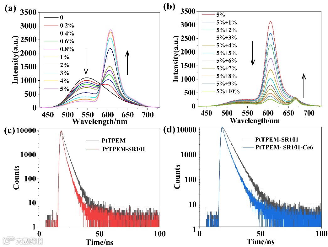 图2. (a)向PtTPEM中加入不同量的SR101的发射光谱变化图。(b)向PtTPEM-SR101体系中加入不同量的Ce6的发射光谱变化图。(c)PtTPEM与PtTPEM-SR101(20:1)的荧光寿命衰变曲线。(d)PtTPEM-SR101与PtTPEM-SR101-Ce6(20:1:2)的荧光寿命衰变曲线。