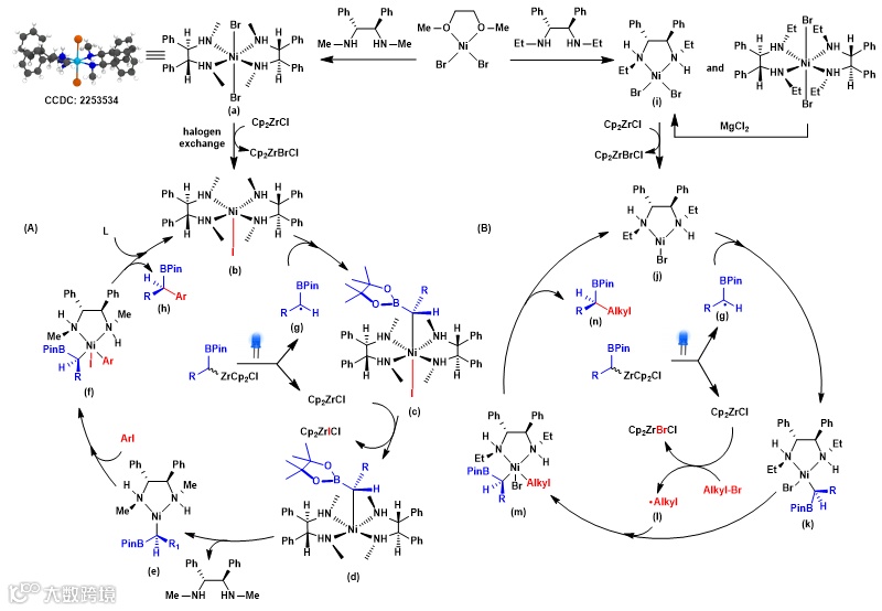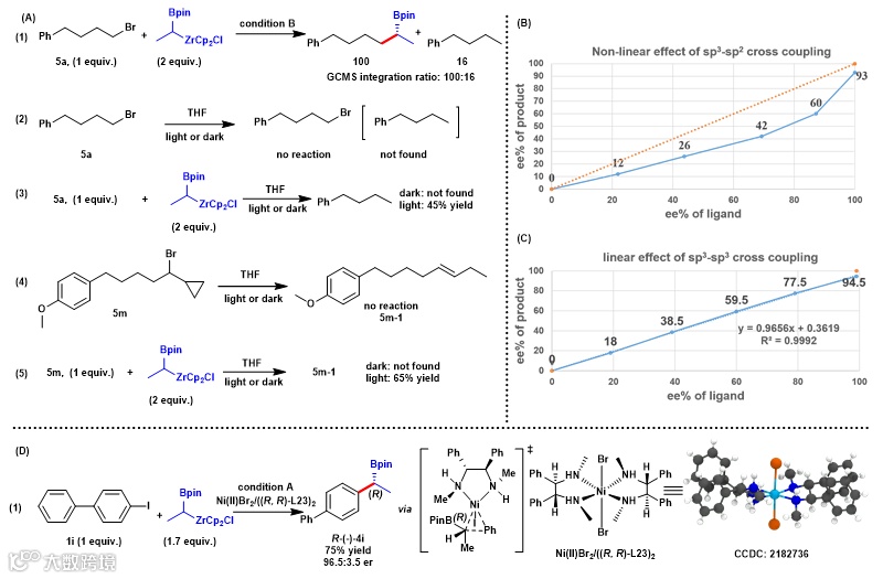 在N,N-二乙基-1,2-二苯基乙二胺催化的C(sp3)–C(sp3)不对称偶联反应中,其配体与C(sp3)–C(sp2)反应中的配体仅是甲基/乙基的区别,然而却展现出了截然不同的反应机理。经测试,配体与产物的ee值呈线性关系,因此在手性决定步骤中推测镍为单配体状态。此外,在反应动力学实验中,作者发现C(sp3)–C(sp3)不对称偶联中烷基锆硼与烷基溴代物的反应级数均为1级,结合环丙基甲基溴代物与烷基锆硼在无催化剂下的光照控制实验下的自由基开环过程,作者推测反应可能经历了烷基锆硼在光照下还原烷基卤代烃产生烷基自由基,随后对金属进行自由基加成的过程,而非传统的氧化加成过程。