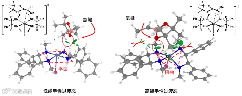 作者随后通过DFT计算定量研究了反应过程,并支持了前文通过实验归纳得到的机理。在对于手性决定步骤的过渡态能量的计算中,预测的对映选择性与实验值相近,通过分析过渡态结构得出了手性二胺类配体通过“氢键锚定”的方式与镍络合物相结合(见上图),在正确构型的过渡态中,两个二胺配体维持了一个四边形平面,而在错误的构型下,由于配体位阻的存在,频哪醇硼烷的头部与配体发成了挤压,扭曲了整个配位平面,进而导致了能力上升。作者对手性控制的计算研究对二胺类配体在不对称反应中的性质和手性控制模式提供了新的思考。
