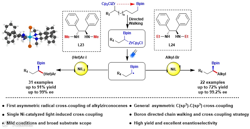 有机金属亲核试剂参与的对映选择性偶联化学是构建C(sp3)–C(sp3)化学键的高效方法之一。然而目前不对称偶联策略所应用的亲核试剂大多基于烷基锌试剂、烷基镁试剂,少数基于特殊的烷基硼试剂(9-BBN)。而相对较为容易制备、对活泼氢、官能团具有较好兼容性的烷基锆试剂却鲜有研究。目前只有牛津大学的Stephen Fletcher教授完成了烷基锆与α,β不饱和酮的不对称共轭加成反应(ACA,Nat. Chem., 2012, 4, 649)和与烯丙基卤代烃不对称取代反应(AAA,Nature, 2015, 517, 351)。近期,北京生命科学研究所的齐湘兵课题组首次开发了由二级烷基锆硼亲核试剂与卤代烃的不对称偶联反应。该工作另辟蹊径,利用可见光照射活化较为惰性的烷基锆试剂,在镍基催化剂的作用下成功与芳基碘、烷基溴分别完成了C(sp2)–C(sp3)和 C(sp3)–C(sp3)的不对称偶联反应,并获得了大量可进一步衍生的手性硼烷中间体,并通过晶体学证据、EPR实验、DFT计算详细研究了自由基的产生、催化剂的配位形式、配体的手性控制等等,在不对称自由基偶联领域开拓了一个全新的研究方向。